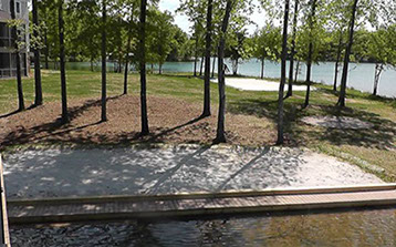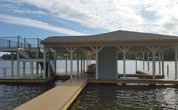 Pier with covered boat slips, screened in porch, 2-story slide, and sunning deck